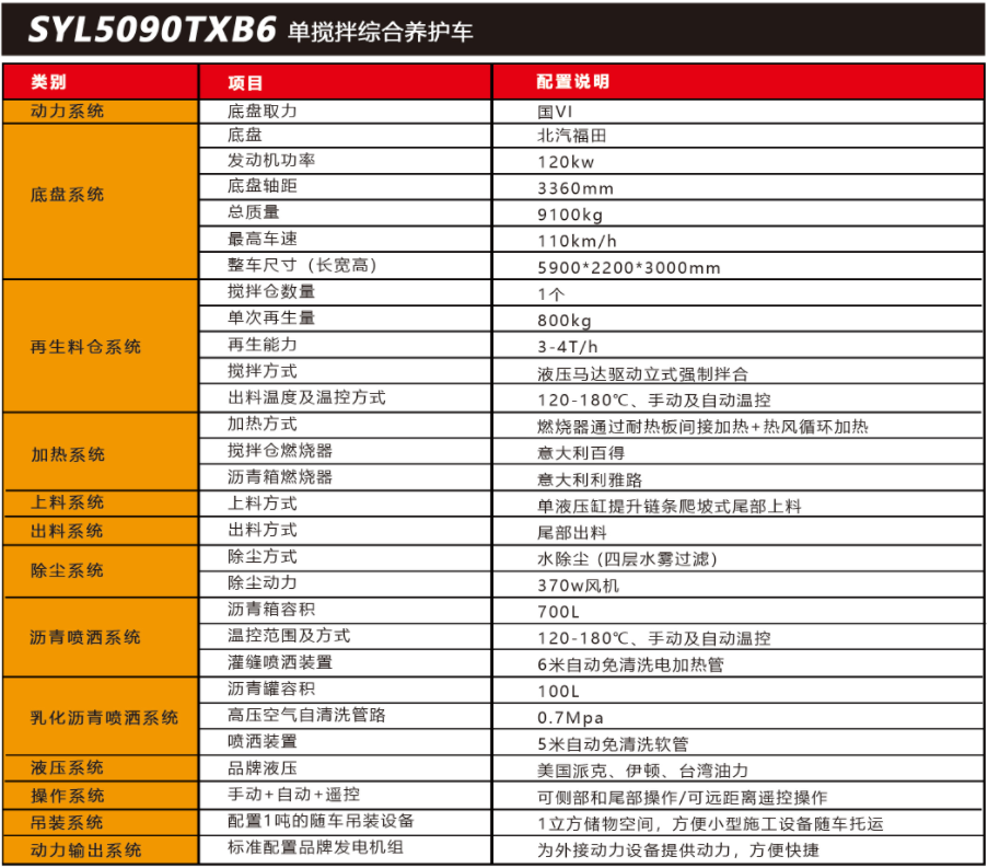 SYL5090TXB6 單攪拌綜合養(yǎng)護(hù)車是一款集現(xiàn)場生產(chǎn)新瀝青混合料、瀝青路面冷料、 舊料、銑刨料 100%現(xiàn)場加熱再生利用 ,熱瀝青灑布、裂紋跟蹤灌縫、乳化瀝青噴灑、為其他裝置提供電力和液壓動(dòng)力等多種功能于一體的瀝青路面熱再生綜合養(yǎng)護(hù)車。可實(shí)現(xiàn)多 場合、多路面的各種類養(yǎng)護(hù)作業(yè) ,養(yǎng)護(hù)修補(bǔ)費(fèi)用低 ,作業(yè)快捷 ,高效率、節(jié)能環(huán)保性能突 出等特點(diǎn)。適用于市政、? 國省道路、鄉(xiāng)村公路、廠區(qū)、園區(qū)等狹窄區(qū)域?yàn)r青路面小型養(yǎng)護(hù)修補(bǔ)施工。