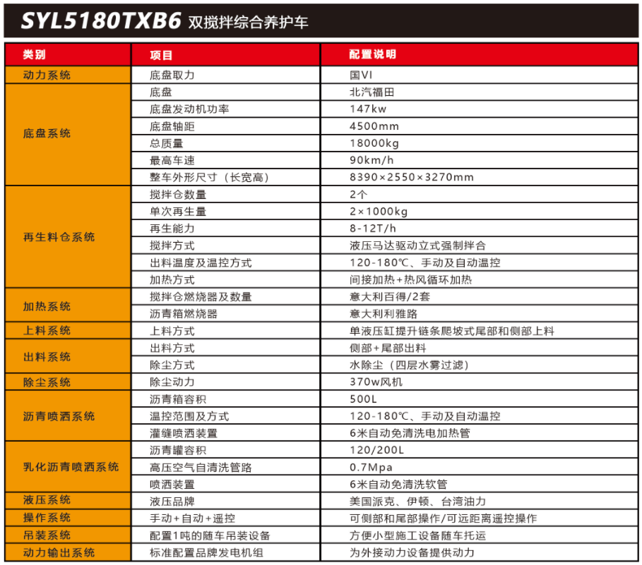 SYL5180TXB6 雙攪拌路面綜合養(yǎng)護(hù)車(chē)是一款集現(xiàn)場(chǎng)生產(chǎn)新瀝青混合料、瀝青路面冷 料、舊料、銑刨料 100%現(xiàn)場(chǎng)加熱再生利用,熱瀝青灑布、裂紋跟蹤灌縫、乳化瀝青噴灑、 為其他裝置提供電力和液壓動(dòng)力等多種功能于一體的瀝青路面熱再生綜合養(yǎng)護(hù)車(chē)。可實(shí)現(xiàn) 多場(chǎng)合、多路面的各種類(lèi)養(yǎng)護(hù)作業(yè) ,養(yǎng)護(hù)修補(bǔ)費(fèi)用低 ,作業(yè)快捷 ,高效率、節(jié)能環(huán)保性能突出等特點(diǎn)。適用于多種路況的中大施工量和高速公路的修補(bǔ)施工。