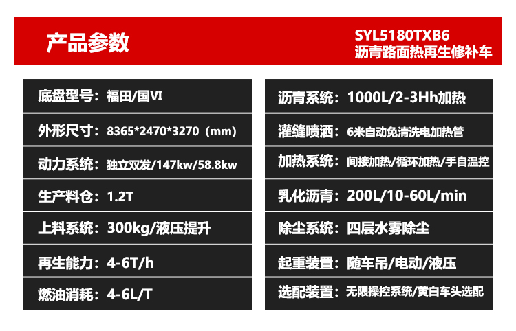1)?具有現(xiàn)場生產(chǎn)新瀝青混合料、瀝青路面冷料、舊料、銑刨料100%現(xiàn)場加熱再生利用,熱瀝青灑布、裂紋跟蹤灌縫、乳化瀝青噴灑、為其他裝置提供電力和液壓動力七大功能。