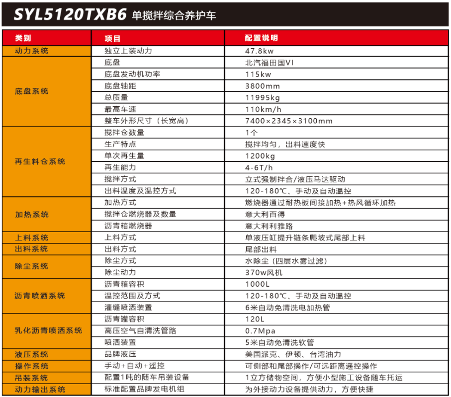 SYL5120TXB6單攪拌綜合養(yǎng)護車是一款集現(xiàn)場生產(chǎn)新瀝青混合料、瀝青路面冷料、舊料、銑刨料100%現(xiàn)場加熱再生利用 ,熱瀝青灑布、裂紋跟蹤灌縫、乳化瀝青噴灑、為其他裝置提供電力和液壓動力等多種功能于一體的瀝青路面熱再生綜合養(yǎng)護車。可實現(xiàn)多場合、多路面的各種類養(yǎng)護作業(yè) ,養(yǎng)護修補費用低 ,作業(yè)快捷 ,高效率、節(jié)能環(huán)保性能突